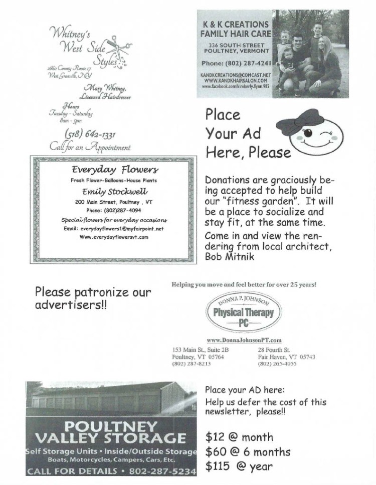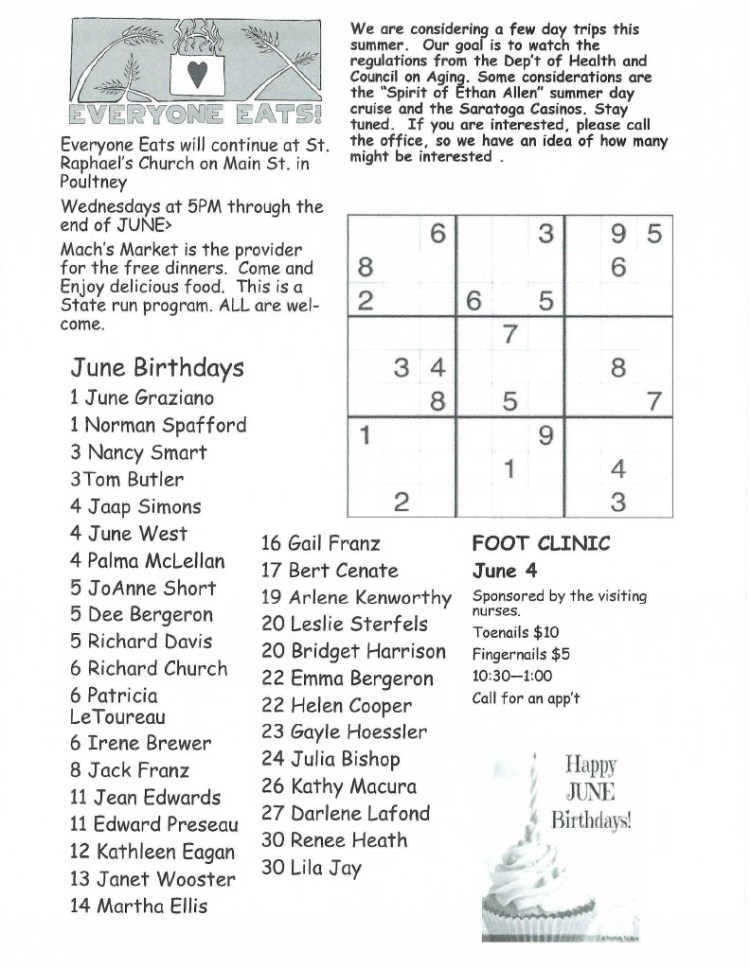 We are considering a few days trips this summer. Our goal is to watch the regulations from the Department of Health and Council on Aging. Some considerations are the “Spirit of Ethan Allen” summer day cruise and the Saratoga Casinos. Stay tuned. If you are interested, please call the office at (802)287-9200 so we can have an idea of how many might be interested.