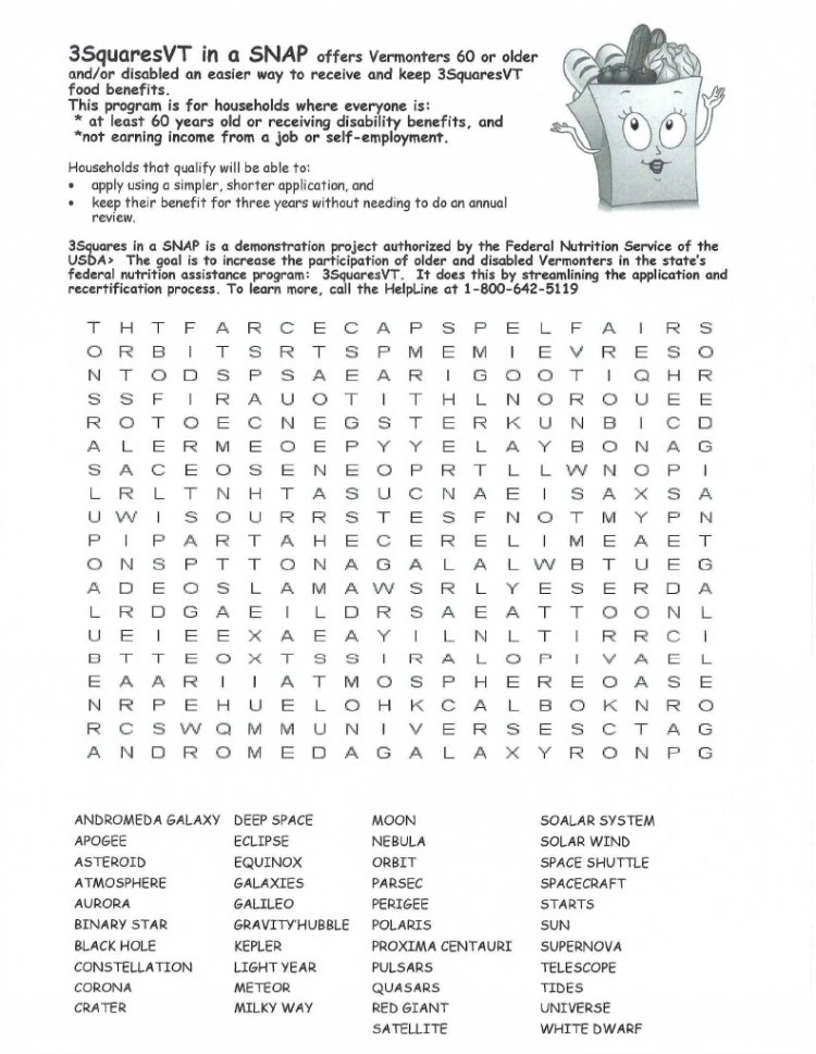 3Squares in a SNAP is a demonstration project authorized by the Federal Nutrition Service of the USDA. The goal is to increase the participation of older and disabled Vermonters in the state’s federal nutrition assistance program: 3SquaresVT. It does this by streamlining the application and recertification process. To learn more, call the HelpLine at 1-800-642-5119 or visit https://dcf.vermont.gov/benefits/3SquaresVT