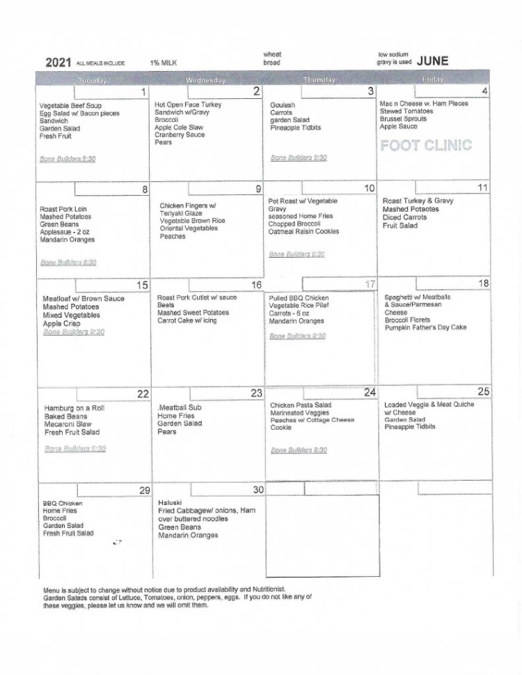 Starting Tuesday, June 1, we are going to have games and lunch outdoors, every Tuesday-Friday at 11:00 weather permitting. CALL (802)287-9200 TO ORDER and pick up your lunch (suggested donations of $3.50 for those over 60) or bring your own. Bring your own chair as well. Enjoy the outdoors and friendships!!! Our goal is to continue to socialize safely.