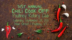 The Poultney Rotary Club is thrilled to announce the 31th Annual Chili Cook Off in downtown Poultney! They will be offering $1,000 in cash prizes for contestants as well as a silent auction, music, and more! Please visit poultneyvtrotary.com for more information and to submit your team roster.