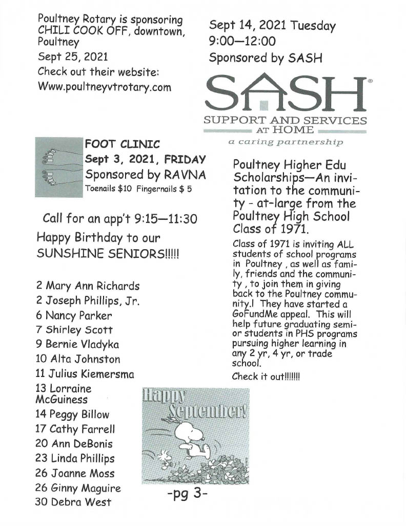 Vermonters feeding Vermonters is back again this year! Produce, meat, and dairy from local farmers is available to our seniors. This is a grant from the Vermont Foodbank. Come and have some fresh food to take home!