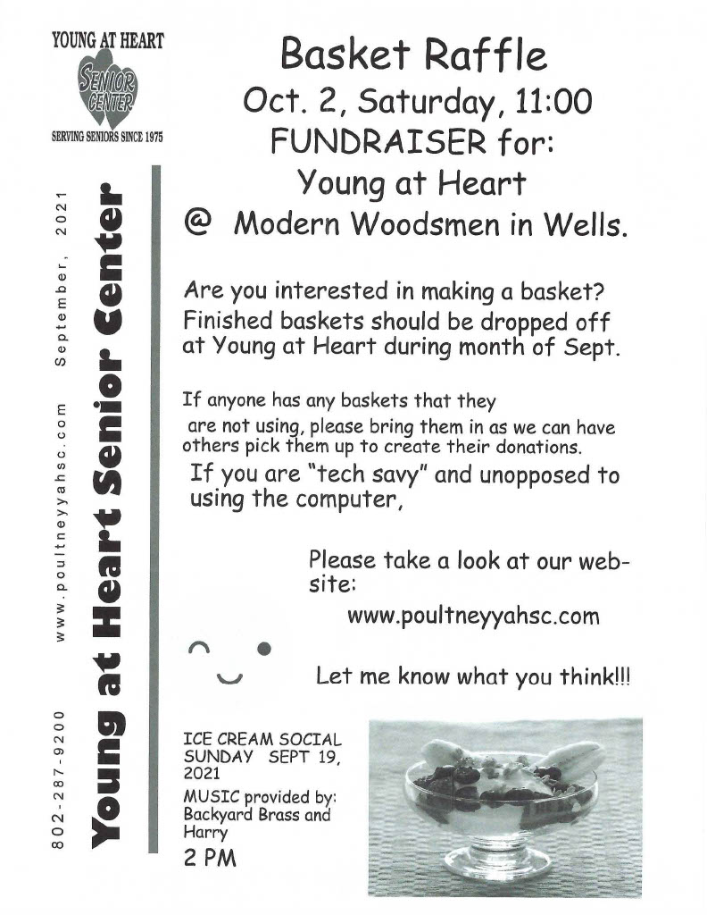 This is a fundraiser for Young at Heart Senior Center being held at the Modern Woodmen in Wells. If you are interested in making a basket, please make sure finished baskets are dropped off at the Young at Heart Senior Center during the month of September.