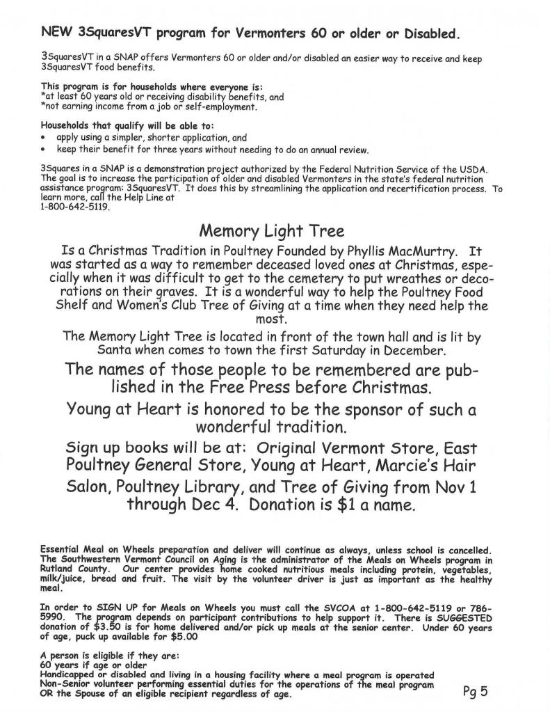 Sign up books will be at: the Original Vermont Store, East Poultney General Store, Young at Heart Senior Center, Marcie’s Hair Salon, the Poultney Public Library, and the Tree of Giving from November 1st through December 4th. The donation is $1 per name.