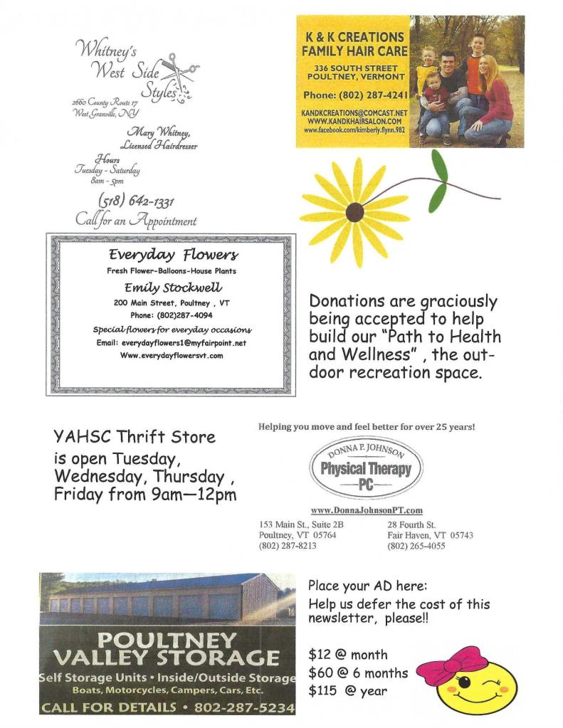 Our volunteer appreciation picnic was a grand success! There is not enough room on a page to fill all the happy faces of the people that keep YAHSC going. Music by Hermit Hollow String Band was beyond fun!! Beth Sterns, outreach Rep from Senator Sanders’ office came to share some great aspects of the future.