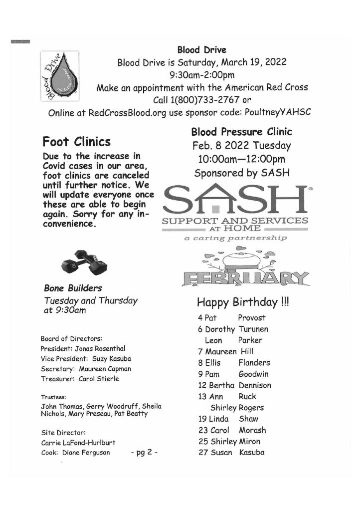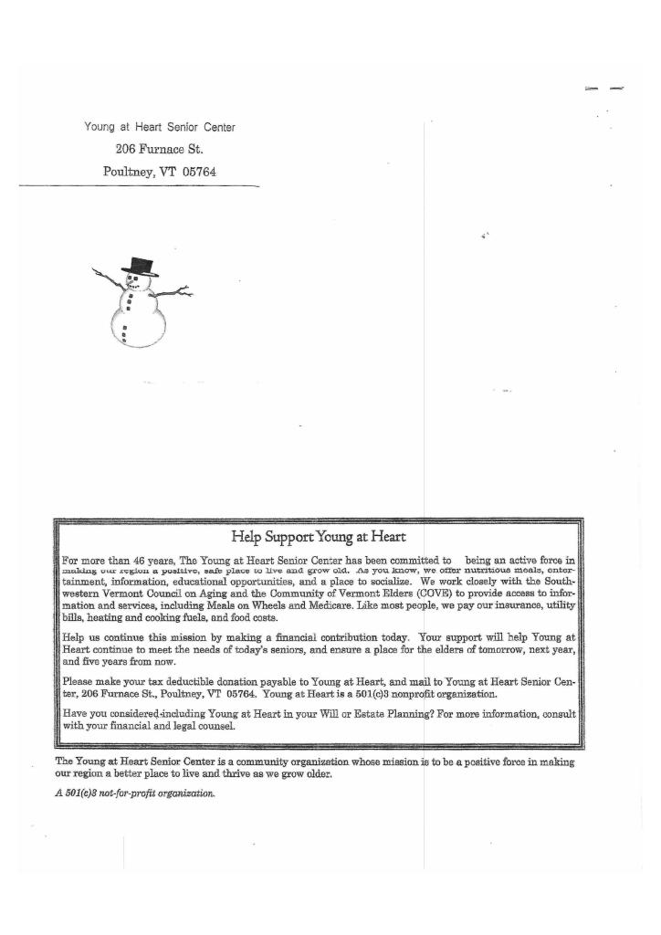Reminder that if the Poultney Schools are CLOSED due to winter weather there will be NO Meals on Wheels that day. Please look at the YAHSC Facebook Page or the local Channel 3 News.