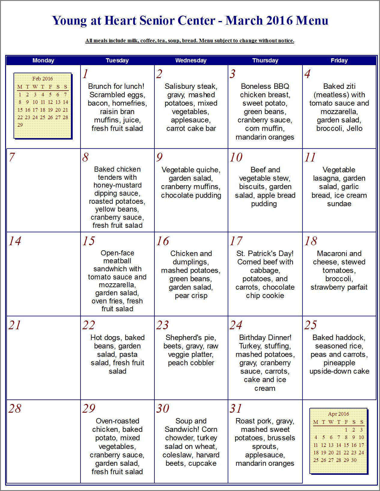 March 2016 menu