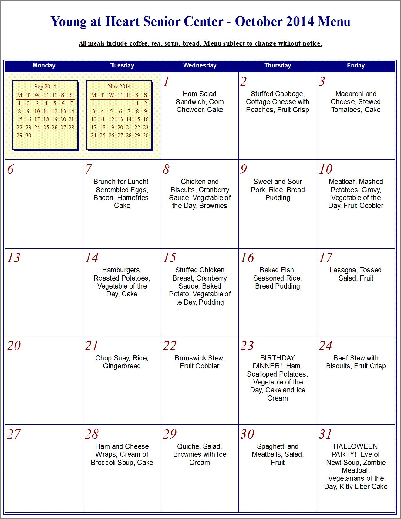 October 2014 menu